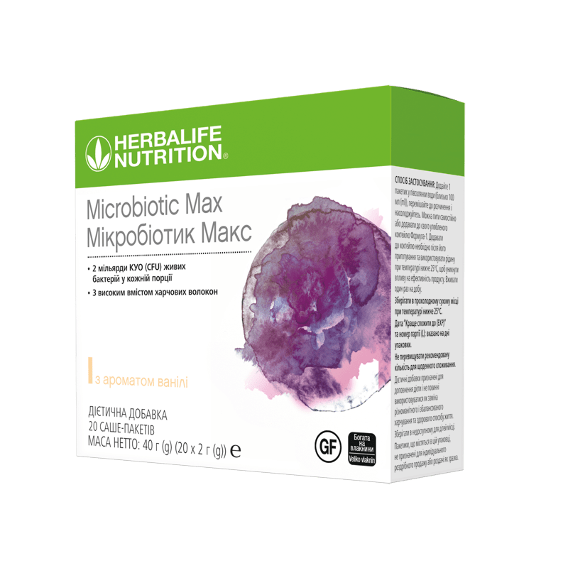 Мікробіотик Макс доступний у коробці з 20 саше, що робить його ще доступнішим для підтримки ваших цілей харчування, де б ви не були.